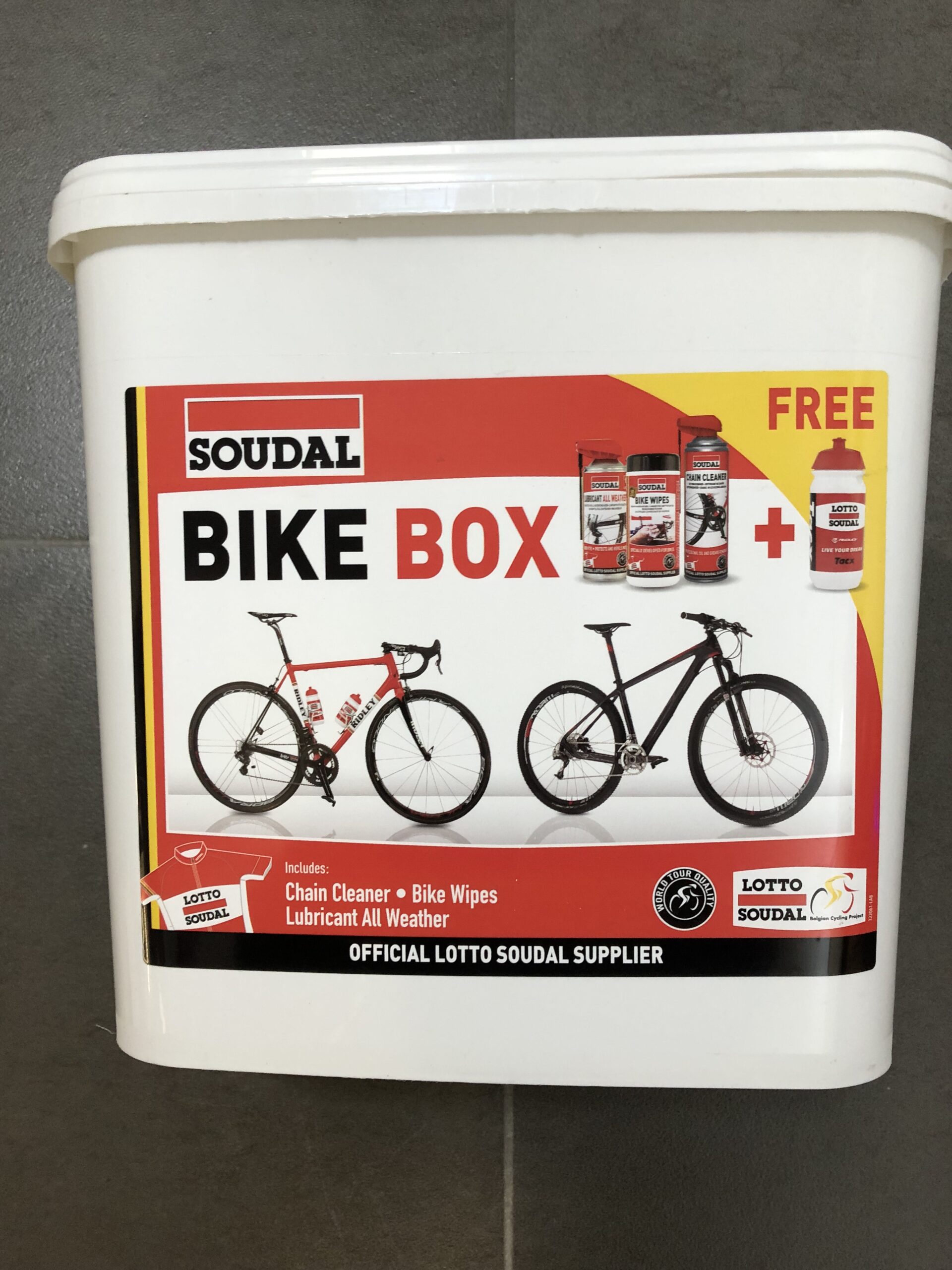 De soudabike box bevat 3 professionele producten uit de soudabike range van soudal, aangevuld met een exclusieve drinkbus van de ploeg Lotto-soudal.